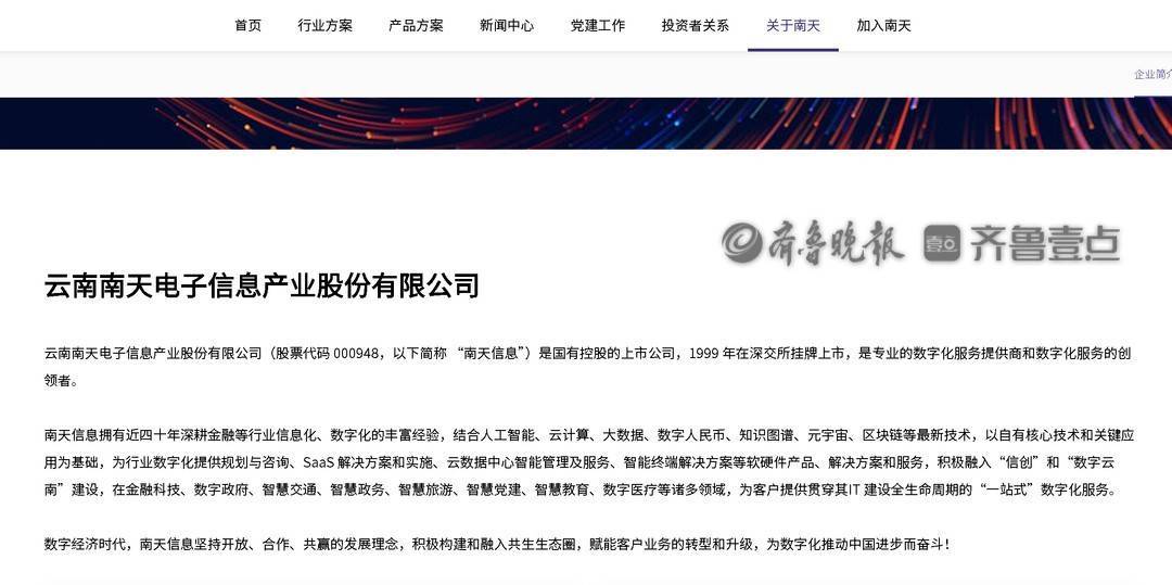 该公司官网显示,南天信息是国有控股的上市公司,1999 年在深交所挂牌上市,是专业的数字化服务提供商和数字化服务的创领者。