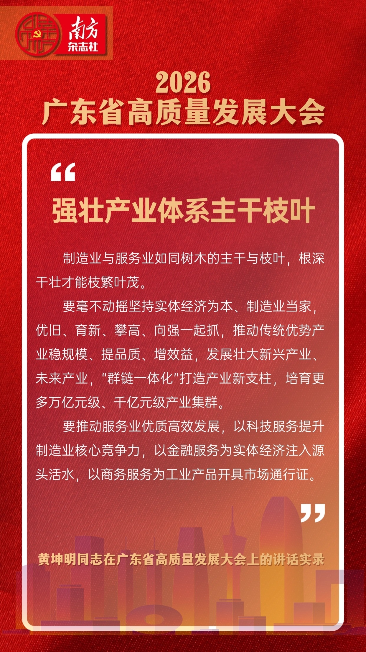 制造业与服务业双向奔赴,关乎广东高质量发展大局、现代化建设全局。黄坤明表示,要以制造业之强牵引服务业之优,以服务业之优增进制造业之强,在“制造强省”与“服务高地”相互成就中打开产业发展新天地,让现代化产业体系这棵大树在广东的发展沃土上深深扎根、茁壮成长。