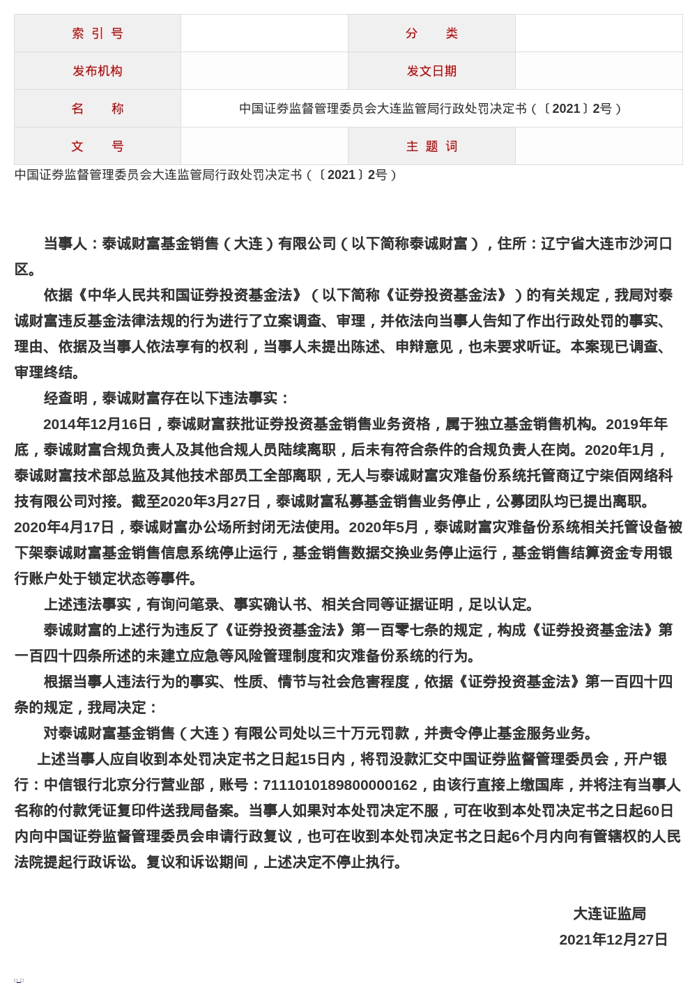 根据当事人违法行为的事实、性质、情节与社会危害程度,大连证监局决定对泰诚财富基金销售(大连)有限公司处以30万元罚款,并责令停止基金服务业务。