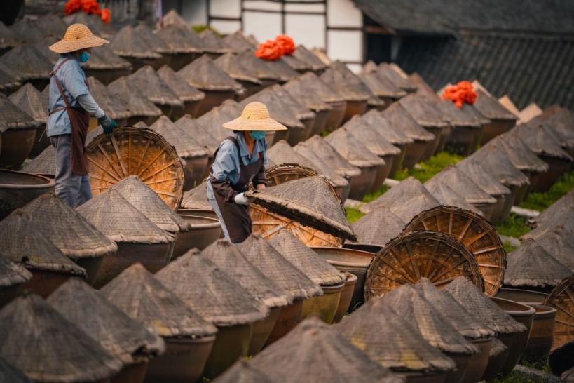 沿着岁月雕琢的青石板路前行,就来到了先市镇酱油庄园。一排排深姜色的晒缸沿着河岸蜿蜒陈列,黑色瓦片铺就的屋檐,在蔚蓝的天空背景下,天然而古朴,仿佛能闻得见酱油的香味……